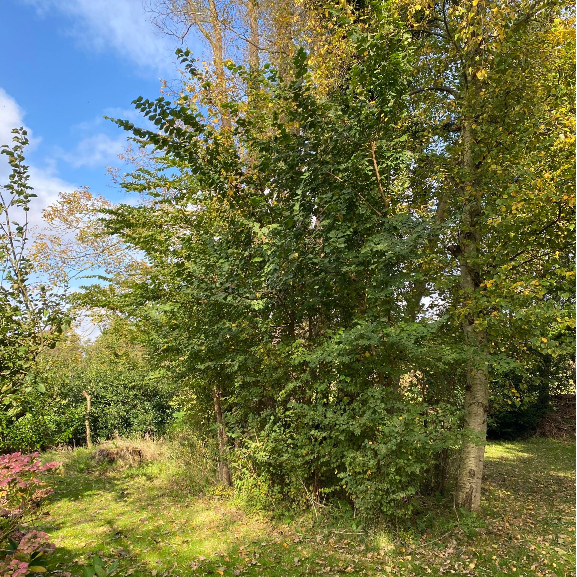 Omdat ook de buren licht in hun tuin willen is de beuk als blokhaag op hoogte gesnoeid. En de appelboom langs het water is licht uitgedund.