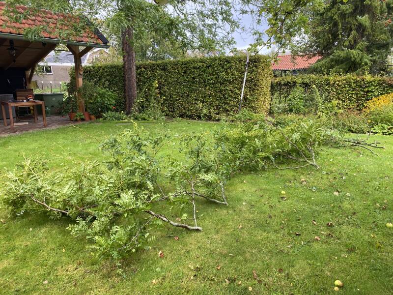 2 appelbomen lagen na storm Poly (juli 2023) op het hek van de buren en moesten hoe dan ook gered worden. Eerst met een tijdelijke actie met lijnen vastgezet en daarna een plan bedacht. Omdat de steunwortels van de bomen vrij matig waren besloten om een stalen constructie te laten maken die voor langere tijd de bomen zullen ondersteunen. Door de gemaakte constructie en de terugsnoei actie hoeven de eigenaren van de bomen zich geen zorgen meer te maken en hopen op een goed appeljaar in 2024.