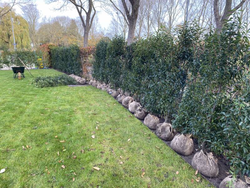 strakke haag aangeplant met Portugese Laurier tegen een matig groeiende beukenhaag aan zodat de klant weer beschut zit