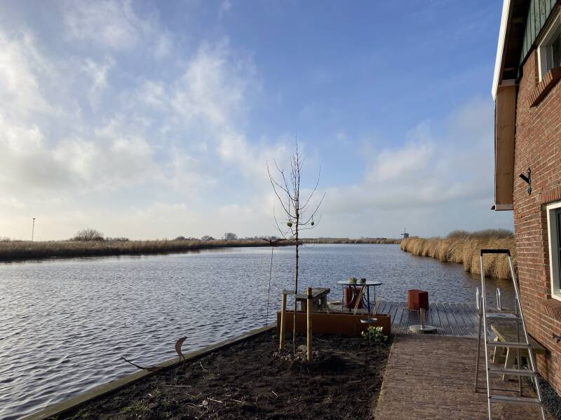 Diverse beplanting aangeplant zoals liguster, laurier, meidoorn, veldesdoorn, sleedoorn en vuurdoorn op deze fantastische plek aan het water.